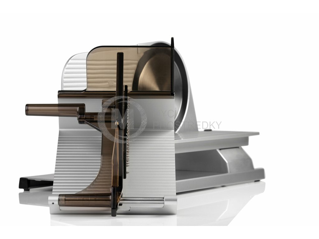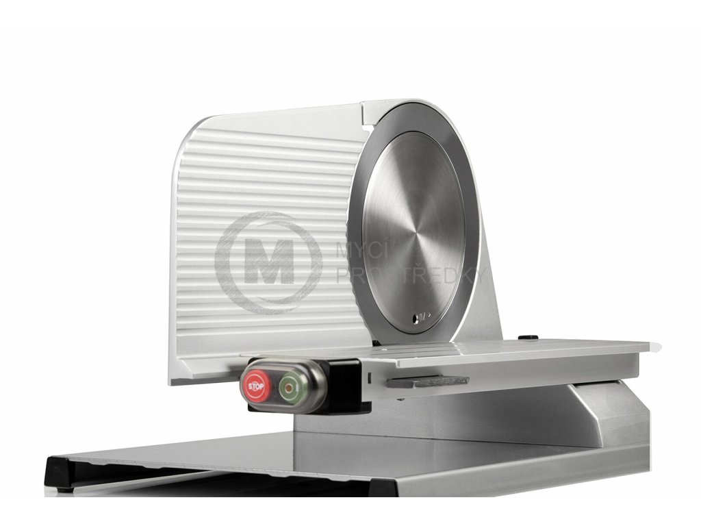 Přímý pohon nože zajišťuje kvalitní motor se šnekovým převodem (tichý převod s velkým točivým momentem) s napájením 230 V a příkonem 185 W. Odlehčený hliníkový vozík s polohovatelnou přítlačkou je uložen vodorovně. Bezpečnostní kryty a přítlačka zajistí bezpečné a snadné posouvání a dokrajování uzenin. Nářezový stroj je vyroben z hliníkové slitiny s odolnou a hygienickou eloxovanou povrchovou úpravou.