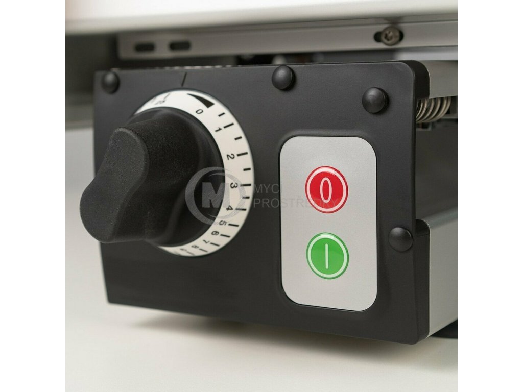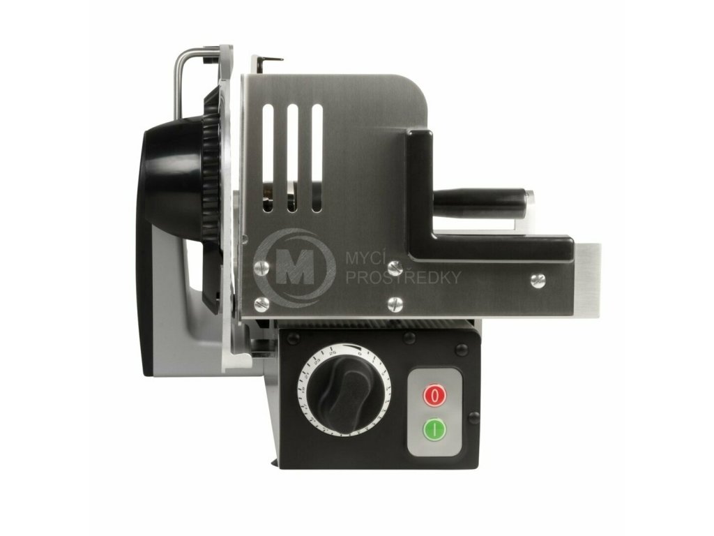 Nářezový stroj manuální pro profesionální použití na porcování a krájení různých produkt (uzeniny, maso, sýr, chléb, zeleninu a ovoce). Vhodný pro gastronomické provozy a menší prodejny. Opravdový multitalent se šírokým spektrem využití. Promyšlená konstrukce stroje zabezpečí nejlepší výsledky krájení, optimální přístup a komfort při čistění. Vysoký hygienický standard. Účinný systém chlazení motoru a hybridní pohon (šneková převodovka pohánějící klínový řemen) umožňuje efektivní a bezúdržbový přenos energie i při nepřetržitém provozu. Důmyslný "L" design umožňuje šikovnou kombinaci a těsné seskupení s úložnými tácky, krájecími deskami, nebo s váhou atd. Maximální řezná kapacita s minimální stopou, přesné a praktické nastavení tloušťky řezu od 0 až do 20mm. Vertikální provedení nářezového stroje, barva odolných plastů : černá (standardní), na objednávku v barvě (červená,bílá)