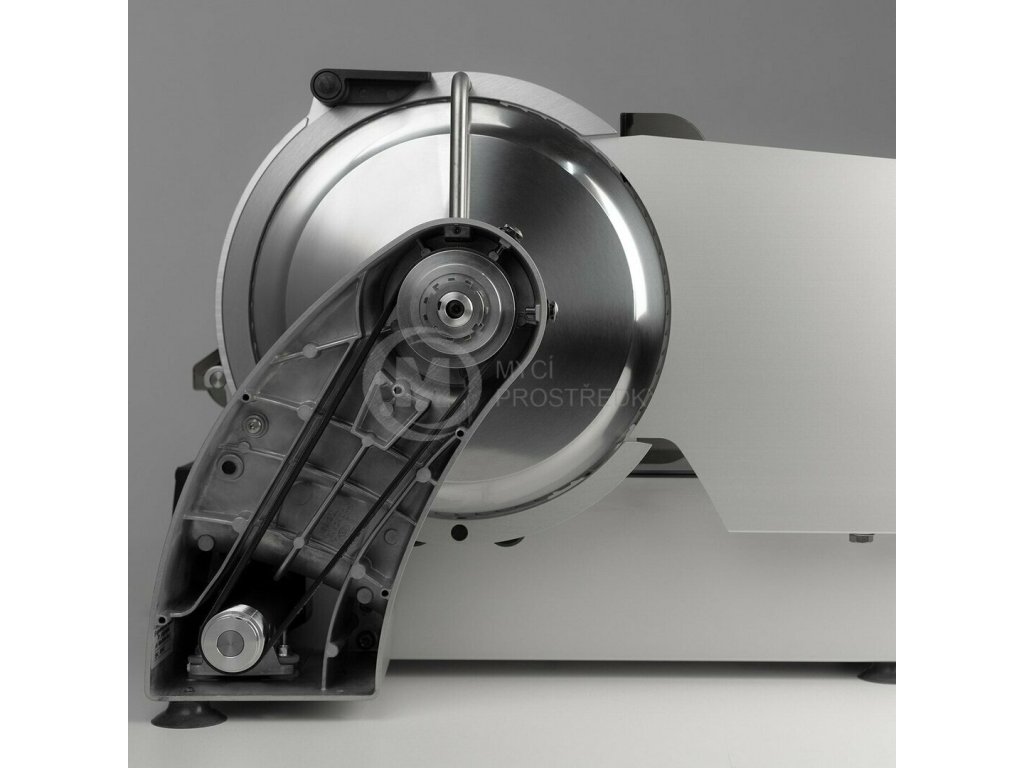 Pohon nářezového stroje zajišťuje výkonný 300 W motor (tichý, účinný, dobře chlazený hybridní pohon (šneková převodovka pohánějící klínový řemen) umožňuje efektivní a bezúdržbový přenos energie i při nepřetržitém provozu)